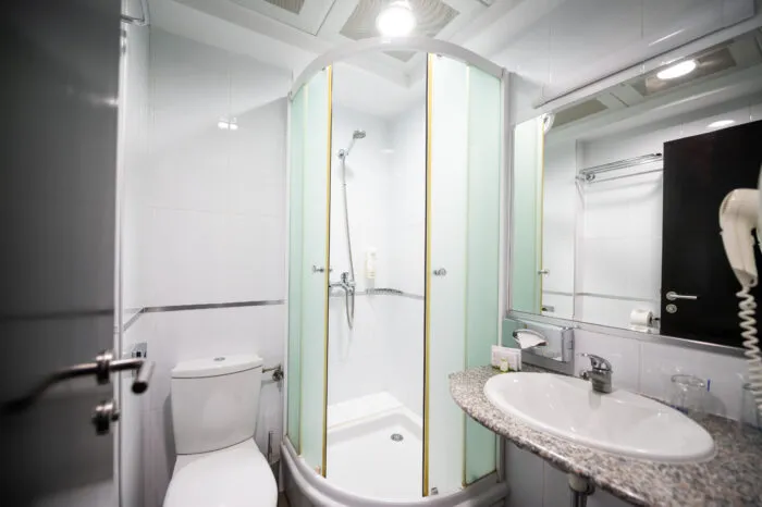 Udobno kupatilo u sobi nudi sve potrebne sadržaje, uključujući tuš, sveže peškire i besplatne toaletne potrepštine. To je prostor gde se možete osvežiti i obnoviti, pripremajući se za predstojeći dan ili opuštajući se uveče.